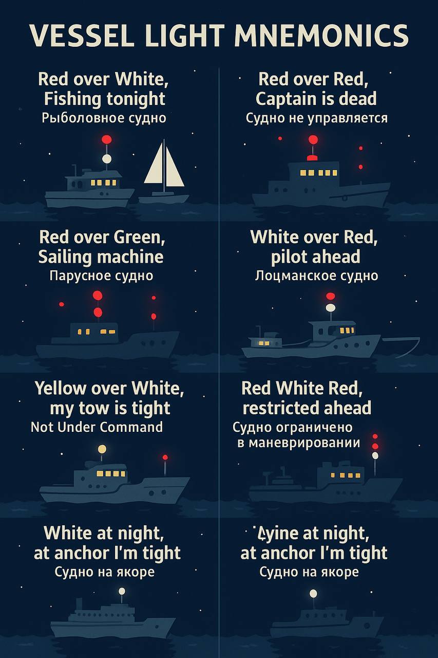 • “Red over Red, Captain is dead” – Not Under Command (судно не управляется) → Два красных огня – судно потеряло управление.